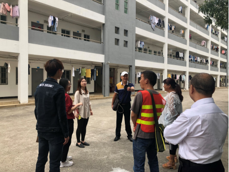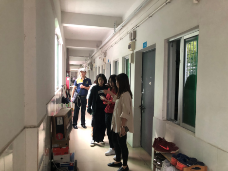 首先,宿管会学生干部到各负责楼栋宿管值班室集合。8点30分,宿管科伍霞晖科长、梁梓雯老师、宿管员班长何淑英、郑杰、保卫处消防管理专员与后勤处清洁班长对学生宿舍进行联合检查。
