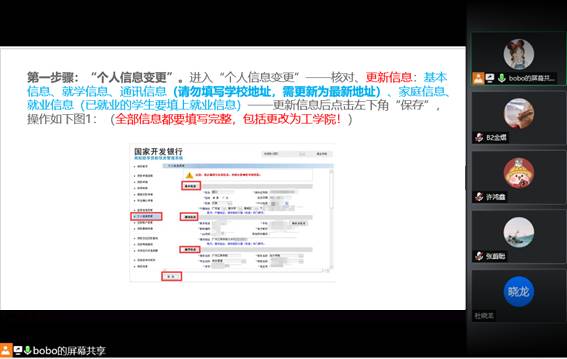 【本网讯】为了提高贷款学生对国家助学贷款的正确认识,强化学生的诚信还贷意识,促进国家助学贷款工作健康持续地发展,工学院资助中心于2021年5月19日晚上20:00在腾讯会议上召开了“大学生诚信还贷”的宣讲会议。本次会议由黄宝玲老师主讲,参与人员为2017级申请了助学贷款的同学。