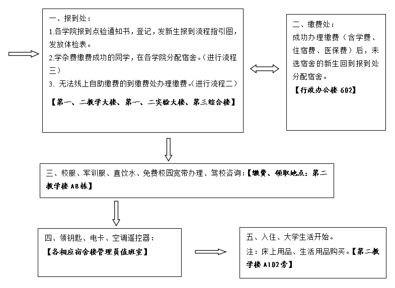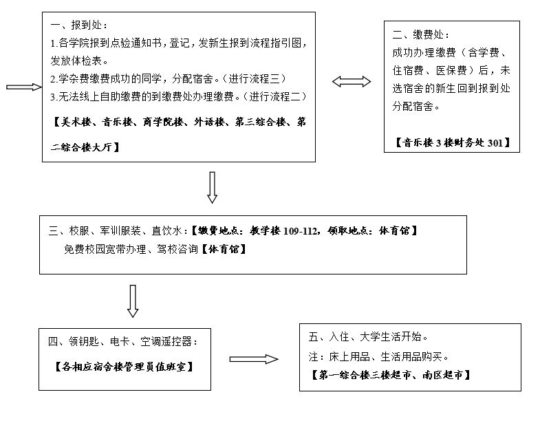 2.交纳学杂费:各学院派在校学生带新生到音乐楼3楼财务处301收费处交费,交费需带录取通知书,交费完毕回到报到处分配宿舍。