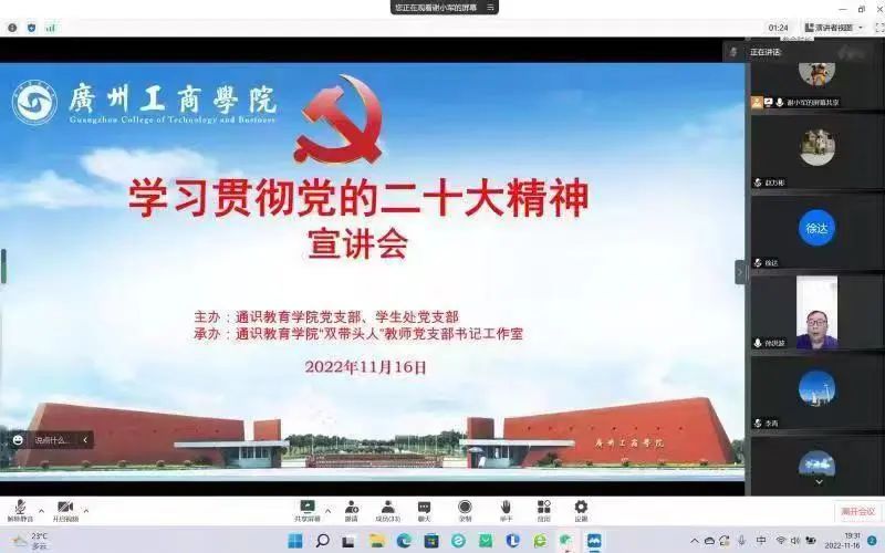 为了落实中共中央关于认真学习宣传贯彻党的二十大精神的决定,深入学习贯彻党的二十大精神,根据kaiyun开云官方网站党委的部署要求,11月16日晚,通识教育学院党支部与学生处党支部联合主办,通识教育学院校级“双带头人”教师党支部书记工作室承办,以线上方式共同举办了学习贯彻党的二十大精神宣讲会。特邀专家、通识教育学院党支部和学生处党支部全体教职工党员参加了本次宣讲会。会议由学生处党支部书记、副处长孙洪波主持。