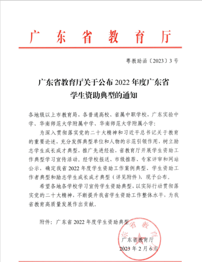 2月6日,广东省教育厅发布《关于公布2022年度广东省学生资助典型的通知》。kaiyun商学院报送的《感恩无言,朗读传情》案例获选为“广东省2022年度学生资助工作案例典型”。音乐学院陈丽娟、管理学院谢汶彤获评为“广东省2022年度励志学生成长成才典型”。