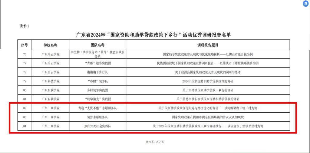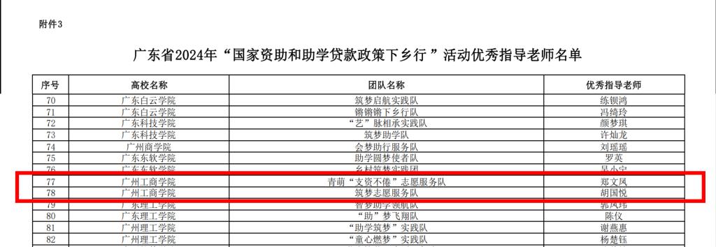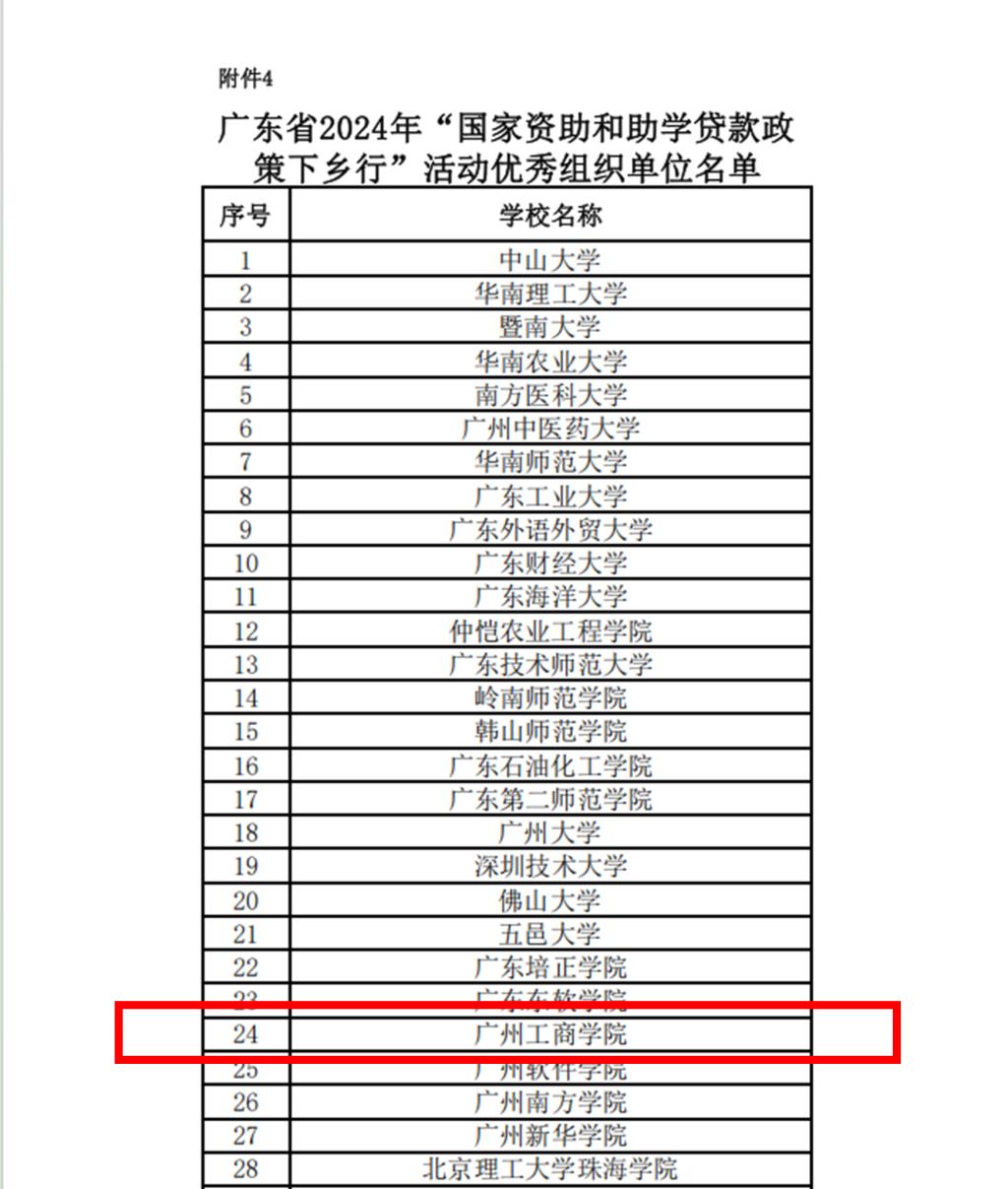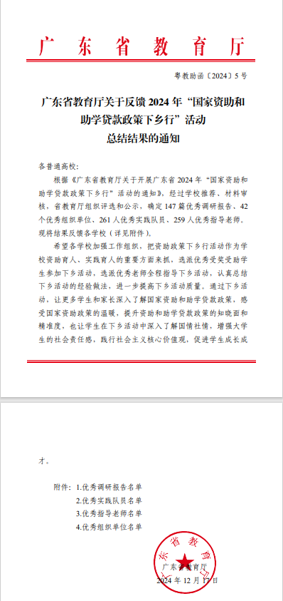 近日,广东省教育厅下发了《广东省教育厅关于反馈2024年“国家资助和助学贷款政策下乡行”活动总结结果的通知》(粤教助函〔2024〕5号),全省共评选出147篇优秀调研报告、42个优秀组织单位、261名优秀实践队员、259名优秀指导老师。kaiyun开云官方网站在广东省2024年“国家资助和助学贷款政策下乡行”活动中共荣获八个省级奖项,分别是优秀组织单位;优秀调研报告三篇;党委办公室郑文凤、管理学院胡国悦两位老师荣获优秀指导老师称号;商学院林庆阳、国际教育学院杨佳禾两位同学荣获优秀实践队员。