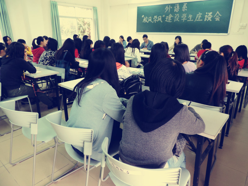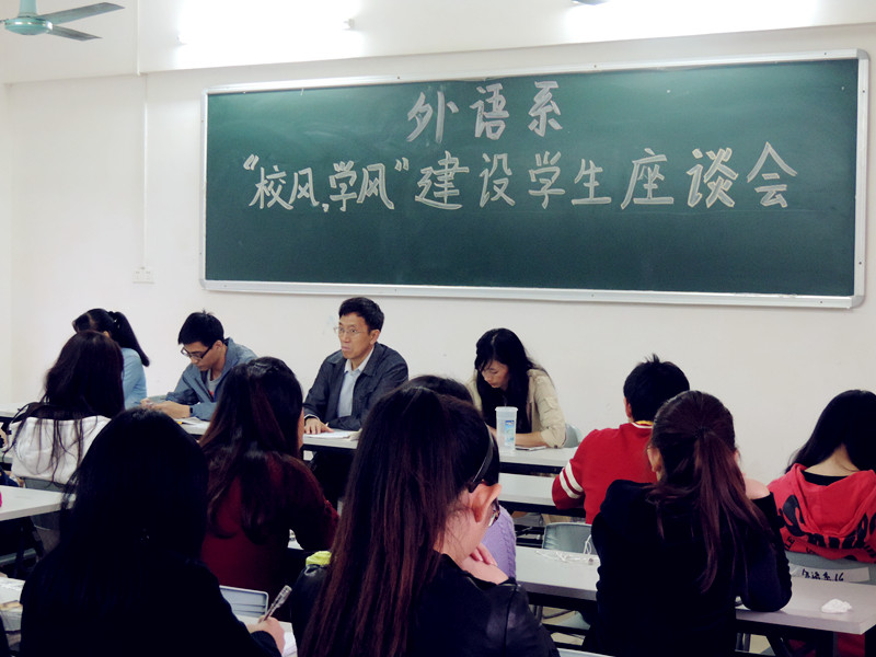 外语系为加强 “教风、学风、校风”建设,于2013年11月20日下午4点30分在外语楼505召开“三风”建设学生座谈会。会议旨在于解决学生对系部教学以及生活中遇到的各种问题,共同营造更好的学习氛围和生活环境。系主任高凤江教授、吴宇辉老师、学工组全体老师和所有年级学生代表参加本次座谈会。