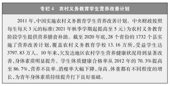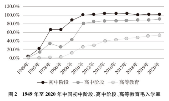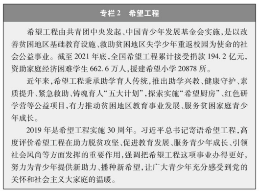 教育机会更加均等。中国教育事业优先发展不断深化,中国青年享有更加平等、更高质量的教育机会。2021年,中国义务教育巩固率达95.4%;高中阶段毛入学率达91.4%;高等教育毛入学率达57.8%、在学总规模达4430万人,居世界第一,越来越多的青年打开了通往成功成才大门的重要路径。覆盖学前教育至研究生教育的学生资助政策体系建成且日趋完善,2020年资助资金总额超过2400亿元、资助学生近1.5亿人次,实现“三个全覆盖”。义务教育阶段进城务工人员随迁子女、农村和贫困地区学生等群体受教育权益得到充分保障。2020年,85.8%的进城务工人员随迁子女在公办学校就读或享受政府购买学位服务;2012年至2021年,农村和贫困地区重点高校专项招生计划定向招生超过82万人,让更多的青年公平享有接受更好教育的机会,阻断贫困代际传递。
