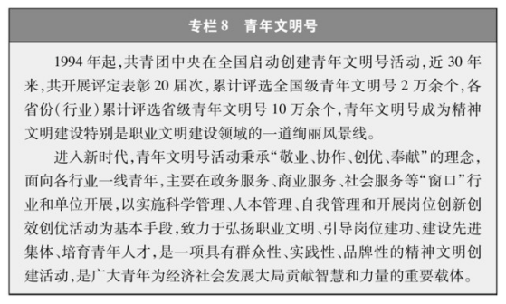无论在城镇还是乡村、企业还是学校,青年都自觉把正确的道德认知、自觉的道德养成、积极的道德实践紧密结合起来,带头倡导向上向善社会风气、塑造社会文明新风尚。在城乡社区建设中,越来越多的青年投身社区治理和服务体系建设,主动参加“社区青春行动”,加强实践锻炼、提升服务贡献。在各行各业,青年秉承“敬业、协作、创优、奉献”的理念,踊跃创建“青年文明号”,大力弘扬新时代职业文明,展现新时代职业形象。广大青年运动员弘扬体育道德风尚,以良好的赛风赛纪和文明礼仪,获得竞技成绩和精神文明双丰收。1993年“中国青年志愿者行动”启动以来,志愿服务成为青年参与社会治理、履行社会责任的一面旗帜,成为青年在奉献人民、服务社会中锻炼成长的重要途径。截至2021年底,全国志愿服务信息系统中14岁至35岁的注册志愿者已超过9000万人,他们活跃在社区建设、大型赛事、环境保护、扶贫开发、卫生健康、应急救援、文化传承等各个领域,弘扬“奉献、友爱、互助、进步”的志愿精神,在全社会形成团结互助、平等友爱、共同前进的新风尚。中国青年志愿者扶贫接力计划研究生支教团、大学生志愿服务“西部计划”连续18年派遣41万余名研究生、大学毕业生,到中西部2100多个县(市区旗)开展扶贫支教、卫生医疗等志愿服务。青年始终是大型赛会志愿服务的主体力量,给千家万户乃至全世界留下深刻印象。
