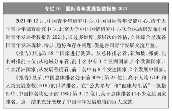 政策保障日益完备。针对中国青年多元化发展需求,国家强化政策服务导向,健全完善政策体系。国民经济和社会发展“十三五”和“十四五”规划鲜明体现青年元素,科教兴国、人才强国、创新驱动发展、乡村振兴、健康中国等国家重大战略充分关注青年群体,青年发展得到越来越多的顶层设计支持。2017年4月,中共中央、国务院制定出台新中国历史上第一个国家级青年领域专项规划——《中长期青年发展规划(2016-2025年)》,为新时代中国青年发展提供根本政策指引。针对青年在毕业求职、创新创业、社会融入、婚恋交友、老人赡养、子女教育等方面的操心事、烦心事,党和政府高度重视,各项政策举措持续出台,青年发展型城市建设蓬勃开展,青年优先发展理念日益深入人心。目前,从中央到地方的青年工作机制基本建成,具有中国特色的青年发展政策体系初步形成。青年充分享受政策红利,实实在在感受到关爱就在身边、关怀就在眼前。