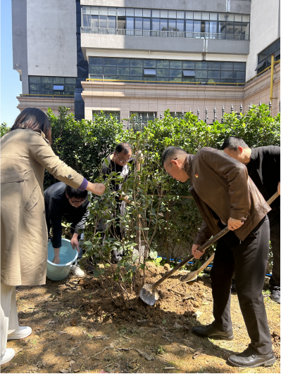 植树活动现场,师生们热情高涨,拿起工具,干劲十足。大家分工协作,培土、浇水,每一个环节都井然有序,每一个动作都充满了对生命的敬畏与对自然的热爱。经过辛勤地劳动,一颗颗小树苗在“一站式向阳学生社区”的土地上扎根生长,它们将成为校园中一道道靓丽的风景线。