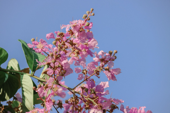是校园一角粉妆玉琢迎风吐艳的百日红。