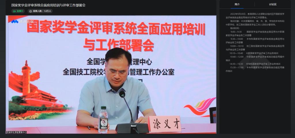 本次培训的主要内容包括:国家奖学金评审系统全面应用与中职国家奖学金评审业务工作部署、本专科国家奖学金评审系统全面应用与评审业务工作部署、技工院校国家奖学金评审系统全面应用与评审业务工作部署、中职国家奖学金评审工作业务培训、中职国家奖学金评审系统评审系统功能应用操作培训、本专科国家奖学金评审工作业务培训、本专科国家奖学金评审系统功能应用操作培训等。培训人员从国家奖学金的管理办法、评审条件、评审程序、评审要求、资助对象认定、材料报送等方面进行了全面细致的讲解。