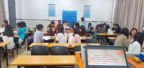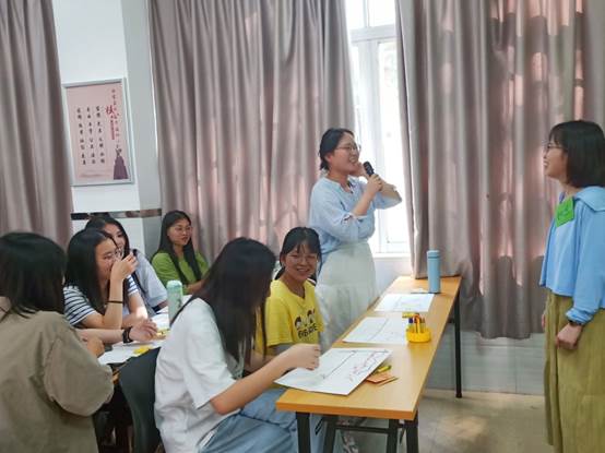 活动第一项是一个热身活动“捉蜻蜓”。所有同学在课室里围在一起,大家在老师的指导下举起自己的左手掌和右手食指分别放在左边同学的食指上和右边同学的手掌下,老师开始念一段故事,要求同学们在听到关键词的时候就要抓住左边同学的蜻蜓,同时也要避免被右边同学的蜻蜓抓住,被“捉”住次数最多的同学要回答老师的问题。整个活动既快速缩进了同学之间的距离,又消除了大家的疲惫感,一时间,活动现场便充满了大家的欢声笑语。