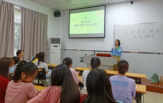 活动第二项是大家相互自我介绍。大家在老师的指示下分为五组,分好组后,老师让每位同学都向组内成员介绍自己的昵称以及来由,还有分享个人的优点与喜好,以便让大家更好的并快速了解对方。渐渐地,同学们都慢慢地打开了自己的心扉畅所欲言,积极投入团体。
