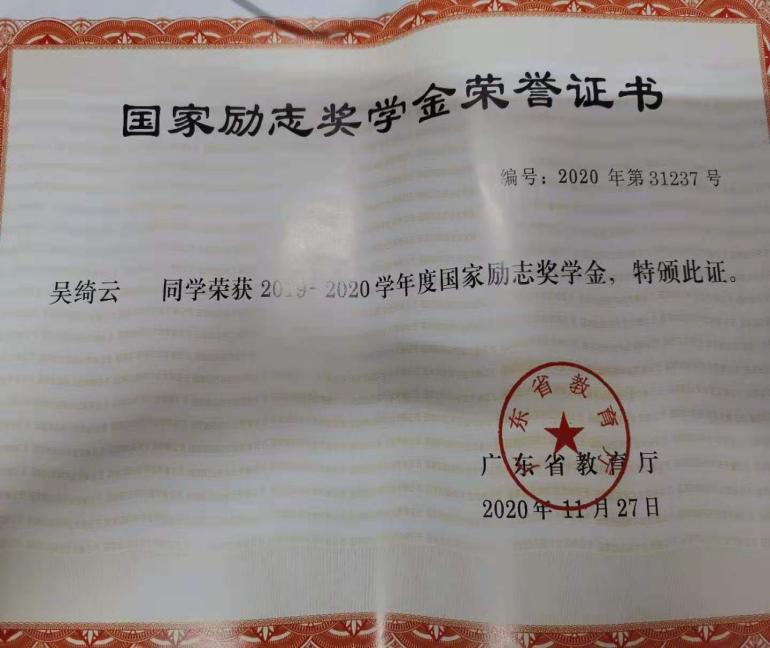 (6)2020年11月,获2019-2020学年国家励志奖学金;