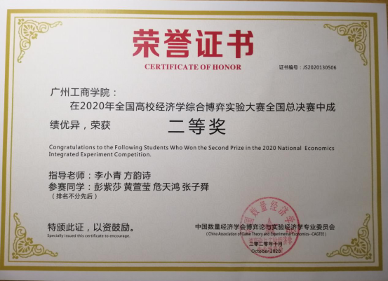 2020年-2021学年第一学期,获2020年全国高校经济学综合博弈实验大赛全国总决赛二等奖,颁奖单位:中国数量经济学会博弈论与实验经济学专业委员会(2020.10);