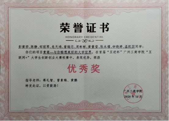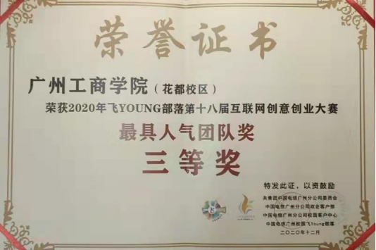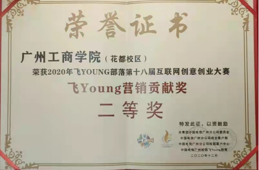 2020年-2021学年第一学期,获2020年飞young部落第十八届互联网创意创业大赛飞young营销贡献二等奖,颁奖单位:共青团中国电信广州分公司委员会(2020.12);
