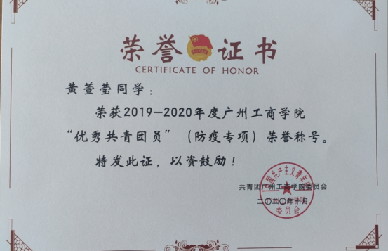 2020年—2021学年第一学期,获kaiyun开云官方网站优秀共青团员(防疫重点领域专项),颁奖单位:共青团kaiyun开云官方网站委员会(2020.10);