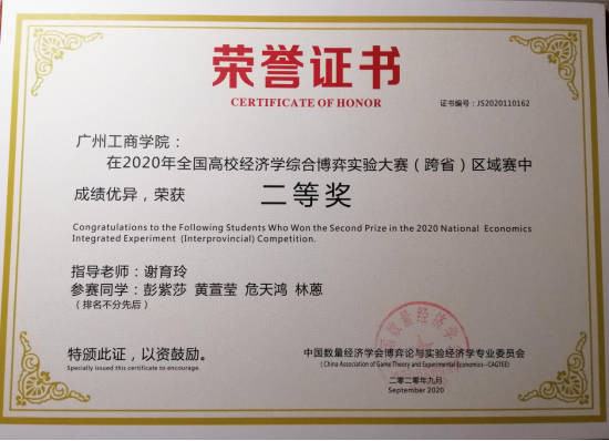 2020年-2021学年第一学期,获2020年全国高校经济学综合博弈实验大赛(跨省)区域赛二等奖,颁奖单位:中国数量经济学会博弈论与实验经济学专业委员会(2020.09);