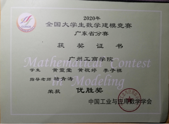 2020年—2021学年第一学期,获全国大学生数学建模竞赛广东省分赛优胜奖,颁奖单位:中国工业与应用数学学会(2020.10);