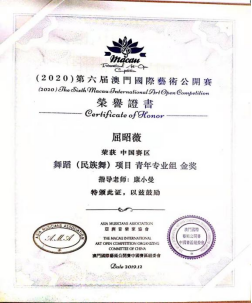 2019年12月,获第六届澳门国际艺术公开赛中国赛区舞蹈(民族舞)项目“青年专业组金奖”;