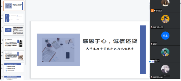 会上同学们还重温了助学贷款相关政策,掌握了在线还款操作技能。通过此次主题班会,促使同学们树立正确的价值观、诚信观,进一步提高大学生言行一致、履约重诺、恪守诚信的思想自觉和行动自觉。