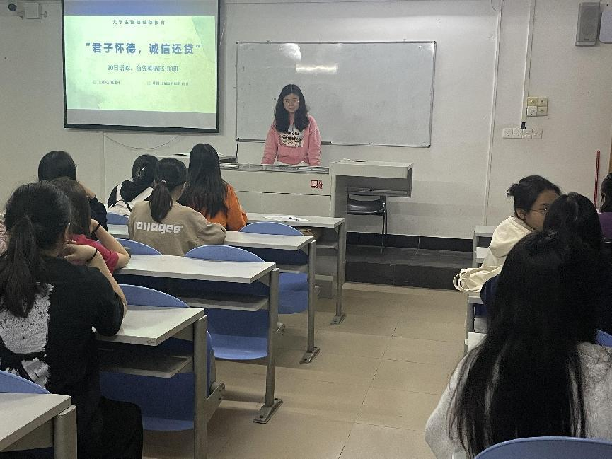 紧接着进行征信教育,各辅导员向大家重点强调了信用制度在同学们毕业步入社会后的重要作用。最后,各辅导介绍关于逾期还款对征信的影响,并列举了一些关于征信的事例,提醒大家要重视诚信还贷,并通过几个真实案例向大家说明不及时还款会对未来生活造成的重大影响。