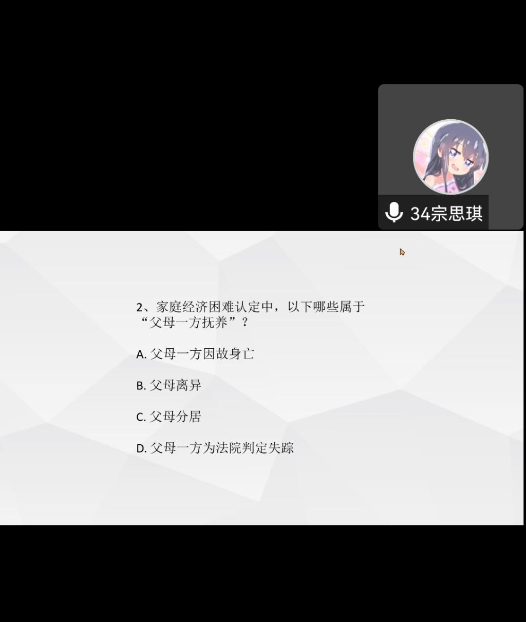 首先,第一个出场的是赵典老师,赵老师主要讲解了家庭经济困难学生认定工作。贫困认证的内容主要分为认定原则、认定依据和等级、认定程序、相关附件填写说明四个部分。赵老师结合实际情况与相关文件要求讲解了认定机构和职责、认定原则、家庭经济困难认定依据、认定程序等相关内容,向参加讲座的学生展示了相关文件,并强调贫困认定工作的阳光操作、始终秉持公平公正的原则。此外,赵老师呼吁通过贫困认定的同学应更加严于律己,遵守学校的各项规章制度,展现良好的大学生形象,赵老师最后以一个趣味答题环节结束了此次贫困认定的讲解,既巩固了受助学生对贫困认定的相关知识,又始受助学生对贫困认定工作有了更加全面的了解。