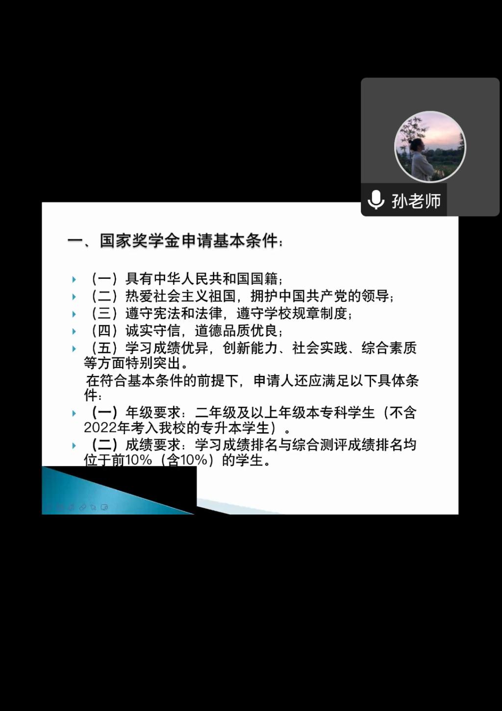 紧接着,第二个出场的是孙畅泽老师,孙老师主要讲解了国家奖助学金的相关内容。国家奖助学金主要分为国家奖学金、国家励志奖学金、国家助学金三大部分。孙老师向同学们详细地介绍了2022年国家奖助学金的评选条件、评选程序、申请材料的填报要求,通过此次讲座和抢答环节,既提高了资助育人的功效,又充分发挥了国家奖助学金奖优助困的正面引领作用,教育和引导学生树立感恩意识和励志精神。