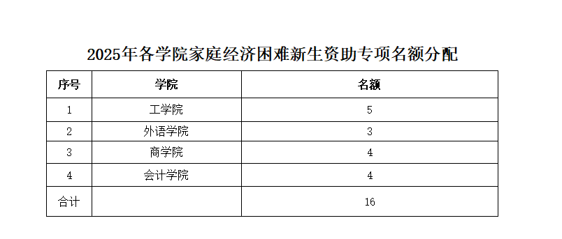 根据前期摸排各学院的困难学生实际情况,工学院等四个学院具有符合专项资助条件的新生,现根据相关学院新生的人数比例分配如下: