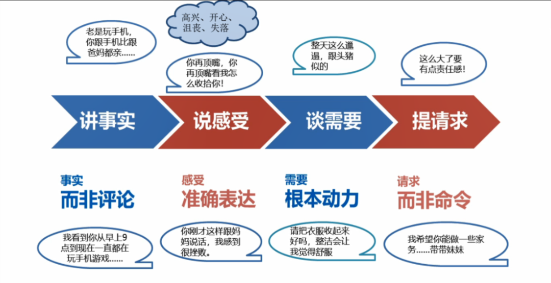 没错,这种有效的沟通方式就是用非暴力的语言去沟通,张老师在视频中给我们介绍了非暴力沟通的四个法宝——讲事实、说感受、谈需要、提请求。家长和同学们可通过下面的图片回顾本节微课的内容。同时,张老师也说到,这四个法宝很难一次就全部用上,能尝试用一两个,就能解决生活中大部分的矛盾和问题。如果想获得更多沟通方面的技巧,或者想详细了解非暴力沟通,推荐大家阅读《非暴力沟通》这本书~
