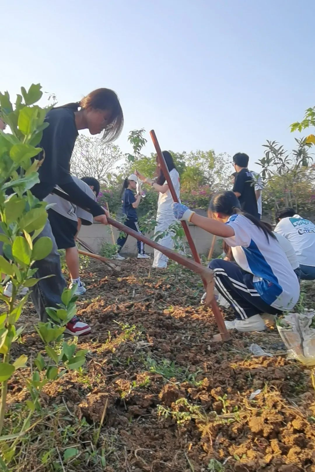 随着时间的推移,同学们也从刚开始的生疏逐渐变得熟络起来。挖坑、栽植、回填、覆土、浇水,大家相互配合,相互帮助。