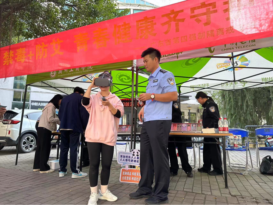 本次活动开设了禁毒防艾活动摊位,广东省第四强制隔离戒毒所的警官们设置了许多禁毒体验活动,例如禁毒视觉VR、毒瘾模拟手环、迷眼放弹珠和禁毒知识问答等,通过这些活动,让同学们身临其境地了解毒品的危害,从而远离毒品。