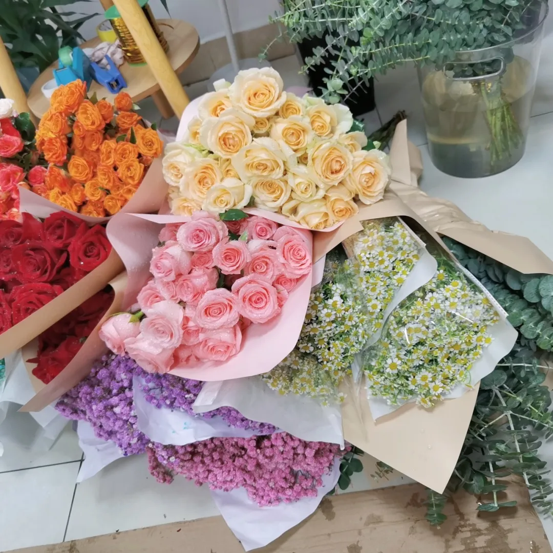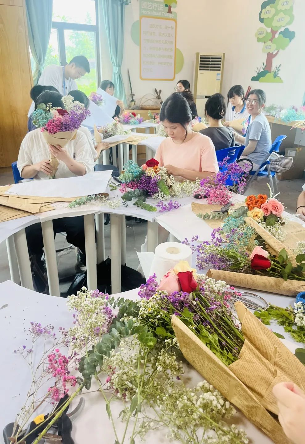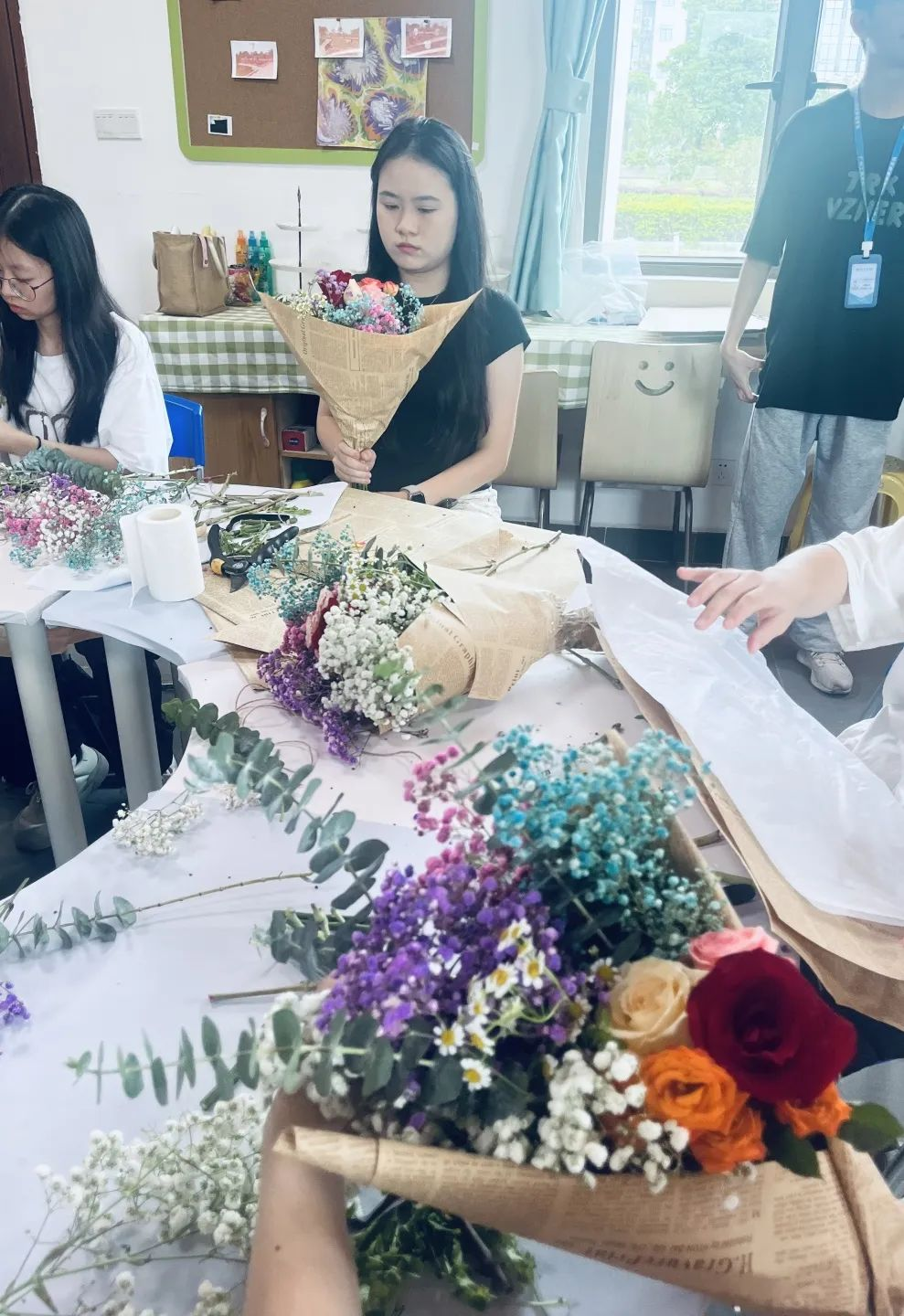 活动现场,花香四溢,各种鲜花、绿叶、花枝等插花工具放在桌上。同学们围坐在桌子旁,拿起剪刀、包装纸等工具,充分发挥自己的创意和想象力,将各种花卉、绿叶巧妙搭配,创造出了一幅幅精美的插花作品。