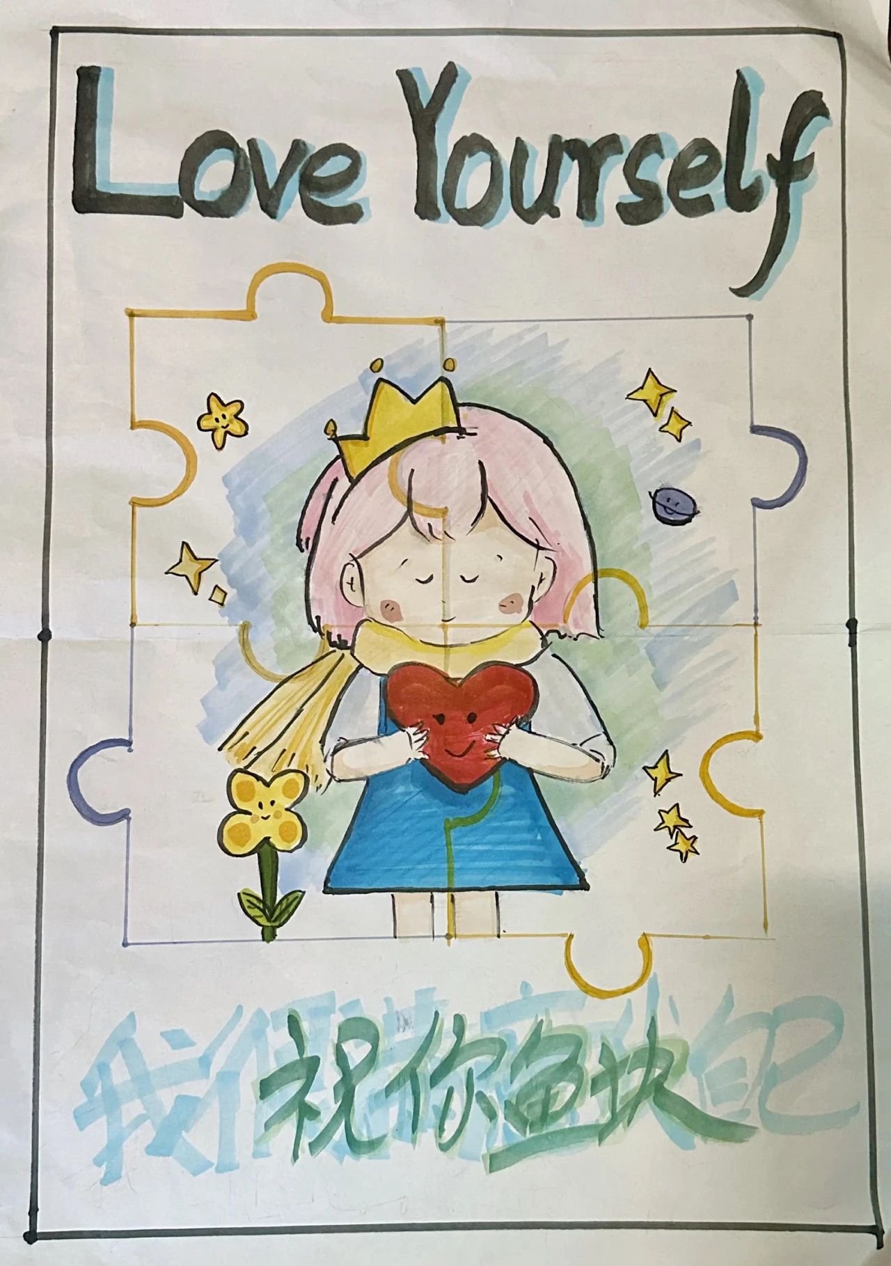 创作思路:作品运用了“拼图”的形式来表达自己的内心世界是拼凑的,在互联网时代,年轻人看到别人在社交媒体发布“秀优越”的内容,会与自己的生活进行比较,然后导致自卑心理,这是不正确的,因此我们要拥抱自己,接纳自己,爱自己,自己要把“我很满意我自己”挂在心中,这也是底部蓝色的字样,“祝你鱼块”运用谐音的手法表达“祝你愉快”,增加趣味性。
