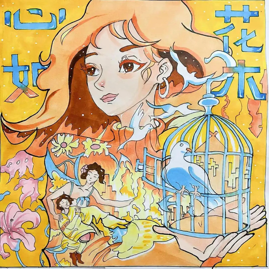 《心如花木》画面中央的人物形象展现出坚韧与温柔,她的头发宛如火焰,象征着内心的热情与力量。鸽子从笼中解放,象征心灵的自由与追求。背景中盛开的花朵和自然景观,表达了生命的美好和繁荣。整个画面充满积极向上的情感和希望,传达对美好生活的热爱和对心灵自由的向往。