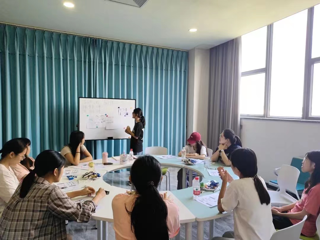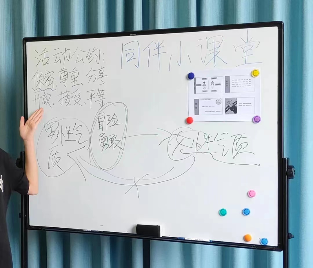 在同伴小课堂中,主讲人引导参与者进行分组,并按照组别对不同性格特质的描述词汇作出分类,明确区分出哪些更常用于描绘男性特质,而哪些则更多地与女性形象相关联,参与同学们对此话题进行热烈讨论。