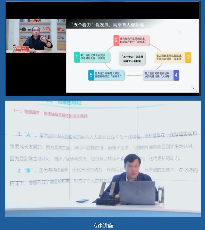 开班仪式结束后会议进入了为期2天的线上培训,首先是专家讲座环节,来自全国思政和网媒专家分别围绕《内卷当下,如何成为你自己》、《校园公共舆论引导的实务问题和建议》、《“变”与“不变”-时空变换下的网络班级建设》、《打造校园网络文化热土,易班学生骨干大有可为》、《高校优秀网络文化作品创作路径探索》、《新”辅导员网红”的生成理路及易班内容创造的启示》、《打造创”易”媒体矩阵,强力赋能网络思政》、《成长型易班学生干部的赋能与自我赋能》、《融媒体时代下-如何用短视频做好宣传》等九个主题,开展学生讲座培训。