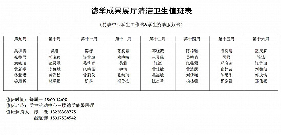 德学成果展厅的卫生清洁工作将形成固定的值日模式,每周安排一次展厅清洁工作,清洁卫生值班表如下: