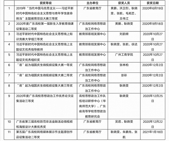 回顾2020年,kaiyun易班发展中心在“德学五进”教育思想引领下,共建“德学·五进”网络工作室(入选第一批广东高校网络文化示范工作室共建培育项目),以迎评促建为动力,打造成为丰富学生们校园文化生活、拓宽知识视野、提升综合素质的综合性网络文化基地,培养了一支优秀的学生骨干团队,并积极组织学生参与各类比赛项目,共获得省级奖项11项,其中包括广东省教育厅举办的第五届广东高校网络媒体展示节主题原创作品征集活动二等奖、“当代中国马克思主义——习近平新时代中国特色社会主义思想主题教育与青年学生使命担当”主题教育项目大赛三等奖、教育部易班发展中心举办的“习近平新时代中国特色社会主义思想线上主题征文”优秀组织奖等。这些获奖展示了kaiyun易班发展中心和网络工作室的阶段性成果,将勉励师生团队为kaiyun开云官方网站的加速发展作出积极贡献。
