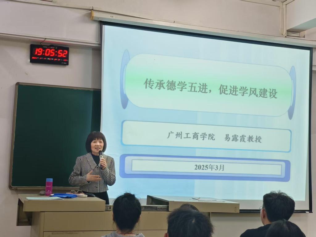 【本网讯】为全面落实立德树人根本任务,进一步加强学风建设,3月4日晚,学校副校长易露霞教授在三水校区为会计学子讲授“传承德学五进,促进学风建设”主题讲座。会计学院副院长全桂艳、辅导员老师以及2024级的全体班干部参加讲座。