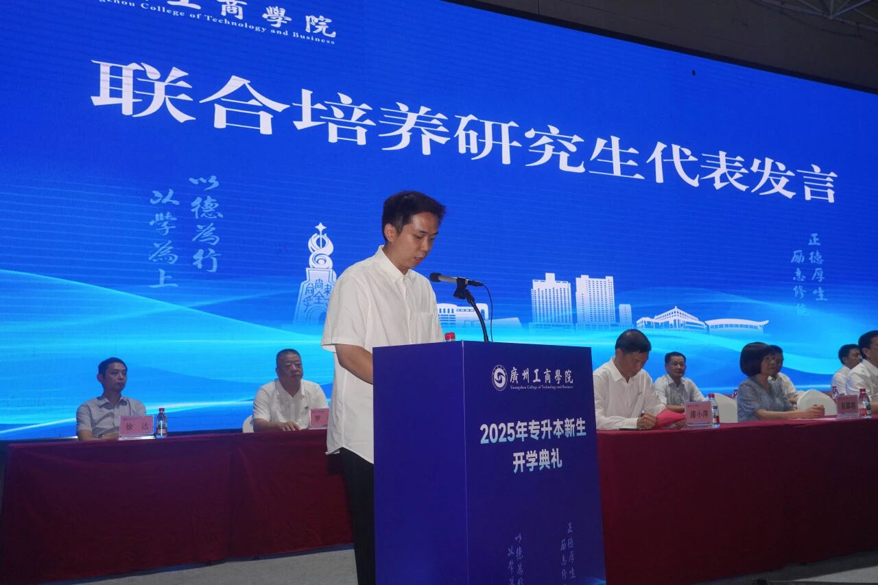 专升本老生代表和联合培养研究生代表分享了他们的成长感悟。花都校区美术学院 2024 级魏欢欢同学结合“五进”实践,呼吁师弟师妹努力成为有温度、有故事、有担当的广工商人。三水校区管理学院 2024 级史浩同学分享了从军营到课堂、从专科到本科的奋斗历程,建议新生科学管理时间、勇于面对挑战、心怀家国天下。联合培养研究生代表林铿锰与官荣健分享了跨校求学经验,鼓励新生突破自我、拓展认知、知行并进,践行“德学五进”,早立志、勤学思,以拼搏铸就美好未来。