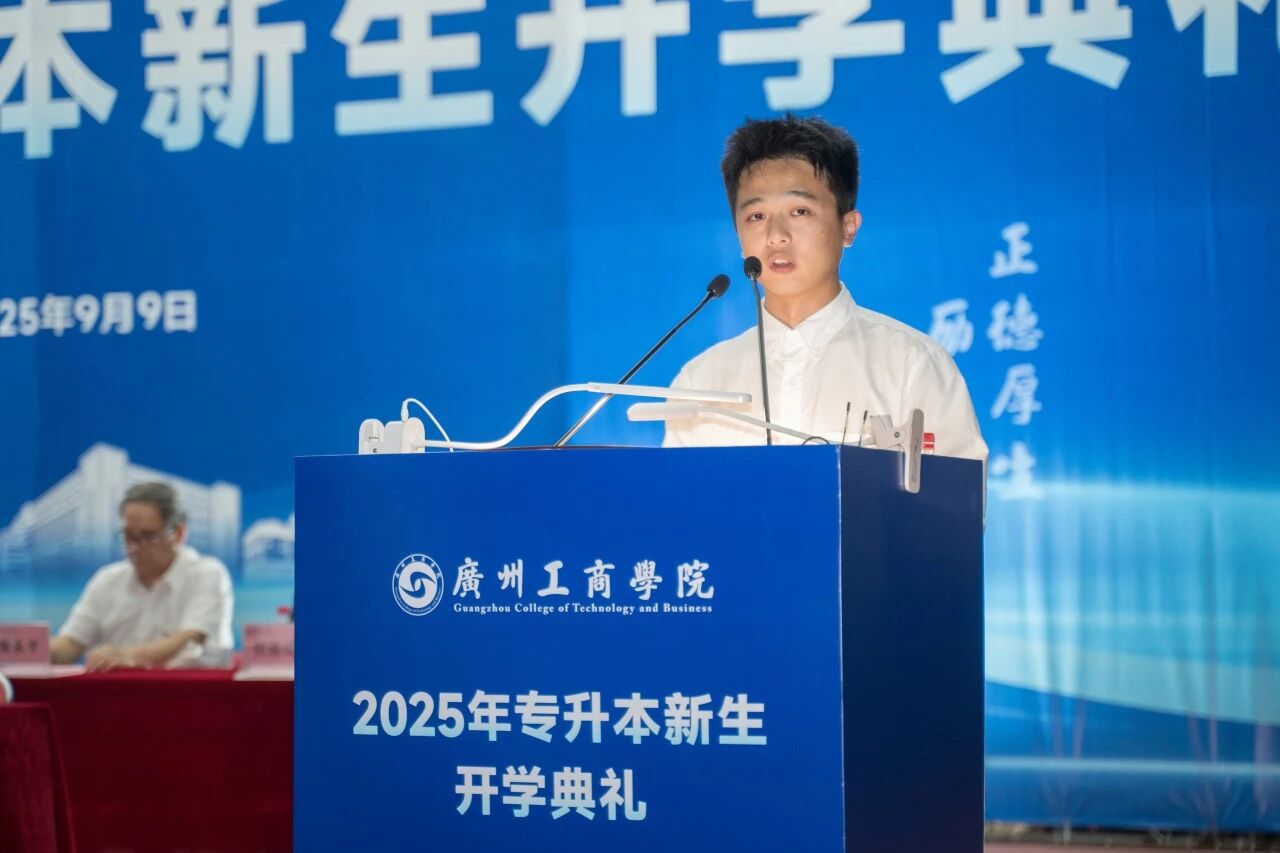 新生代表亦展现出昂扬向上的精神风貌。花都校区音乐学院钟竞乐同学回顾专升本备考岁月,倡议大家坚定理想、勤学笃行、敢于创新、友爱互助;三水校区会计学院贺俊熙同学则表示将以饱满热情投入专业学习,深耕理想、绽放光芒。