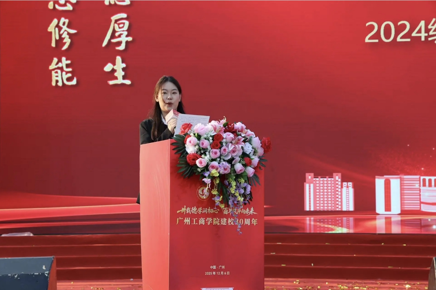 在校研究生代表、与佛山大学联合培养的硕士研究生王雅楠,讲述了在母校的学术成长与精神收获。“我的导师教导我‘学术的尽头是人文关怀’,这让我深刻体会到,在这里所学的不仅是知识,更是‘德能兼备、知行合一’的时代担当。我们将以扎实学识、卓越才能、开阔视野,共同诠释‘广工商人’的深刻内涵,为母校增光添彩,为湾区建设和国家发展贡献青春力量!”