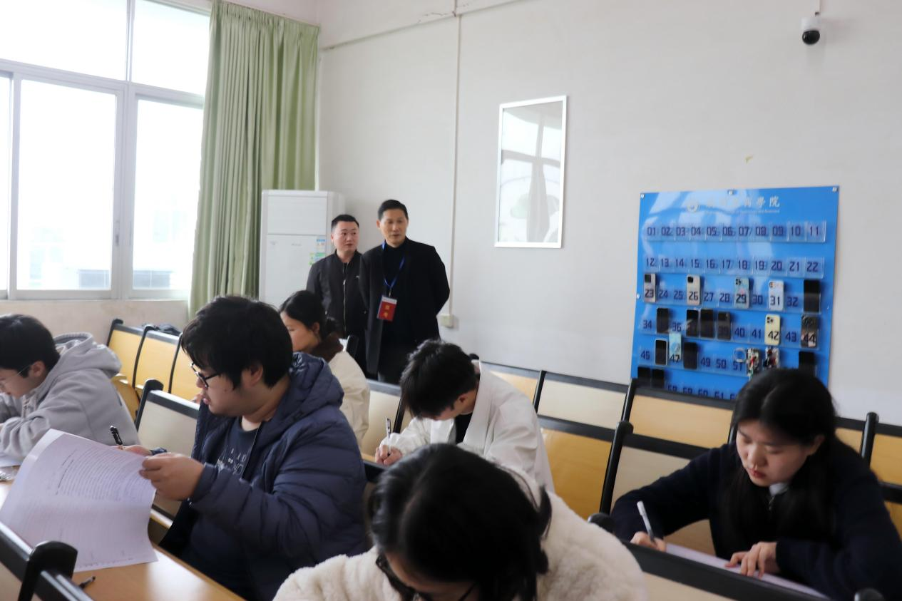【本网讯】为全面贯彻教育教学质量监控要求,严肃考风考纪,确保考试工作的规范性与公正性,1月5日,在本学期全校统一考试首日,学校领导亲自率队,组织教务处、学生处、人事处、数字教育与装备中心、质量监控与评估中心、实践教学中心以及各教学单位负责人,共同组成5个专项巡考组,深入考场开展期末考试的巡视与督查工作。各巡考组通过现场巡查与视频监控巡查相结合的方式,对考试组织、考场秩序、监考履职及考风考纪等关键环节进行了全面、细致的监督检查。