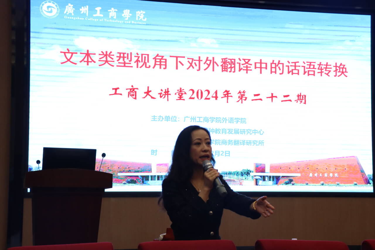 【本网讯】12月2日,学校工商大讲堂2024年第二十二期学术讲座在花都校区举行。成都理工大学张洁教授担任主讲嘉宾,讲座的主题为“文本类型视角下对外翻译中的话语转换”。讲座由外语学院院长刘沛富教授主持,外语学院近百名教师积极参与。