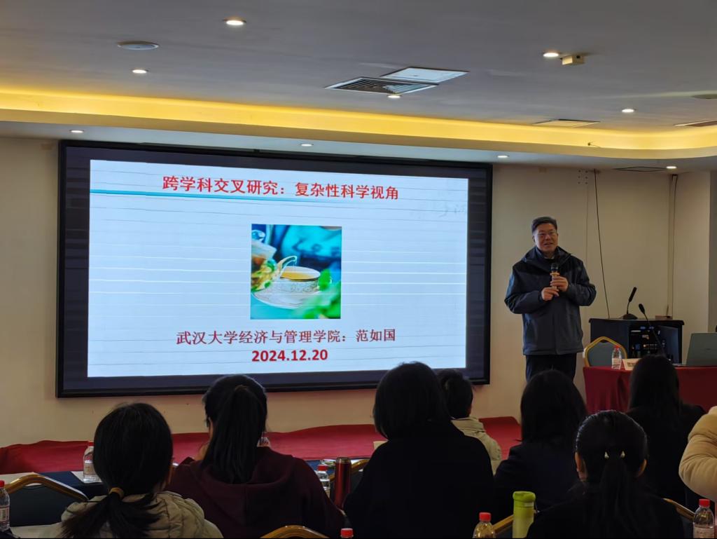 随后,范如国以《跨学科交叉研究:复杂性科学的视角》为题作报告。报告中,范如国详细阐述了学科交叉的内涵及其在现代科学研究中的重要性。他指出,学科交叉有助于打破传统学科壁垒,促进知识的创新与发展。在当今科技迅猛发展的时代,学科交叉已成为推动科学研究和技术创新的重要途径。范教授结合自身的科研经历和实例,深入浅出地讲解了学科交叉在实际应用中的优势与挑战。他强调,学科交叉研究需要研究者具备宽广的视野和跨学科的思维方式,能够从多个角度审视问题。