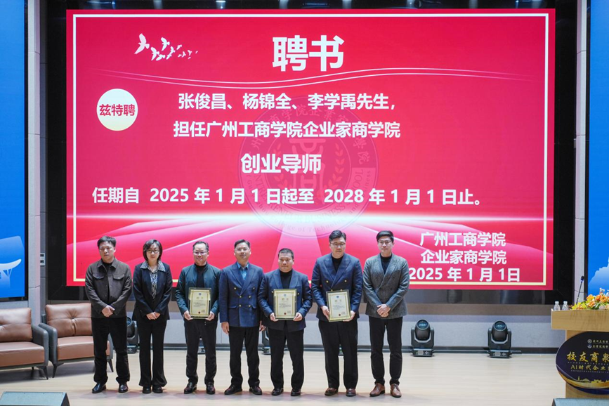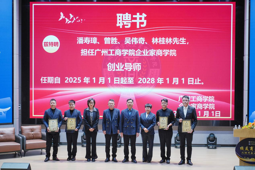 广州微框科技有限公司总经理曾胜分享《与趋势同行》,探讨AI时代企业的发展趋势;东莞三誉食品有限公司董事长吴伟奇讲述了《一个从山区走出来的穷孩子之创业历程》,分享其励志创业故事;中安天玑产业控股有限公司总经理林桂林带来《从校园到商海:回首往昔,启迪未来》,为同学们提供宝贵建议。随后,论坛进行创业导师聘任仪式,学校领导为七位杰出校友颁发企业家商学院创业导师聘书,旨在联合校友企业家为学校提供更多优质的创业实践机会,指导学生提升创业能力,提升学校创业教育水平。