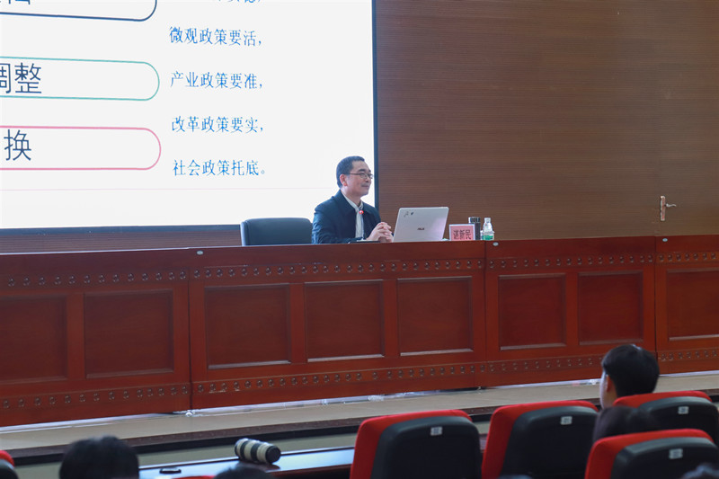 谌新民以《当前经济形势及应对之策》为题,结合时事政治、相关政策和经济发展的数据,分析了我国经济运行总体情况、中美经贸战、广东经济形势三大方面的内容,介绍了当前我国经济工作的总体部署要求。谌新民站在历史和全球视野的高度,运用详实的数据和丰富的案例,回顾了国家和广东省近年来的经济发展情况,引导我们理性正确认识中美贸易战,介绍了广东省做好下一步经济工作的基本布局,讲述了广东在推进粤港澳大湾区建设、构建“一核一带一区”区域发展新格局等方面的工作举措和成效。他认为,我国经济运行总体平稳,较好完成了预期发展目标,政策效应正在显现,市场活跃度改善,今年经济先降后稳的态势可期,经济运行将保持在合理区间。大家要正确认识我国发展的重要战略机遇期,正确认识中美经贸战,相信在以习近平同志为核心的党中央坚强领导下,能有效应对外部挑战。