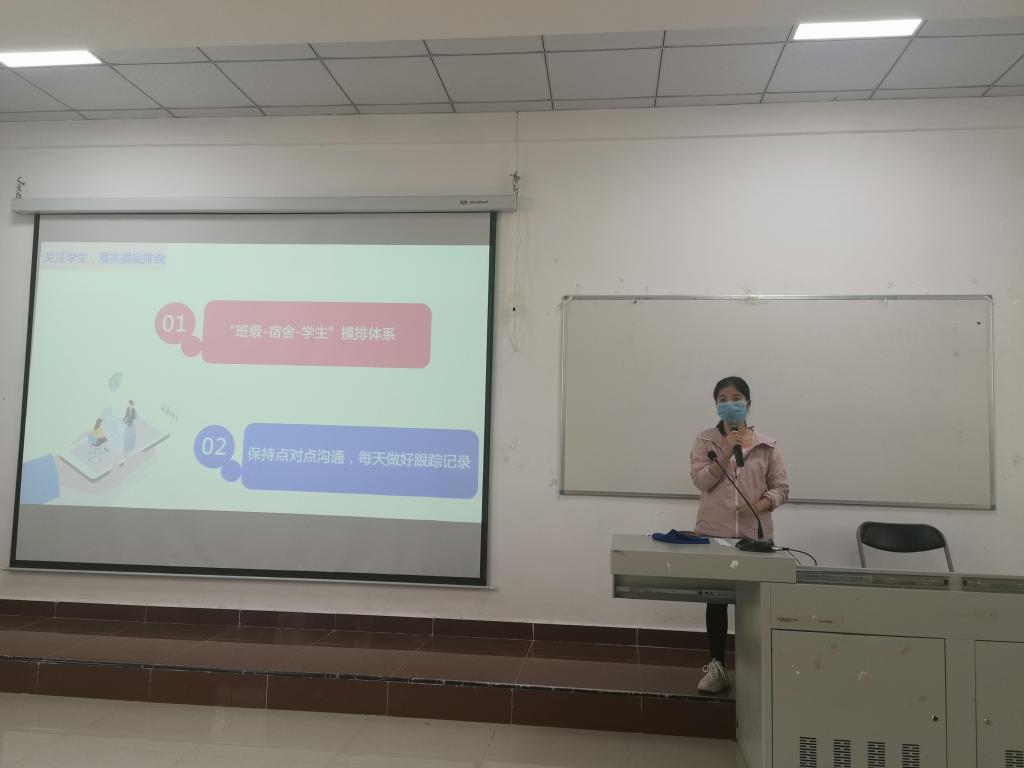 讲座后,由经济贸易系辅导员杨婉君老师交流。她表示,在战“疫”下,辅导员工作应从围绕学生的点点滴滴,提高学生思想重视;关注学生,落实学生信息摸底排查;关爱学生,保障学生身心健康;督促学生,培养学生自我管理;引导学生,汇聚学生正能量等五方面开展工作,介绍在疫情防控期间工作尽职尽责地关爱每一个学生,同时分享了辅导员的线上工作经验。