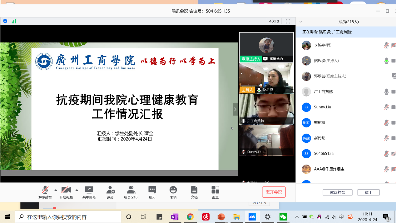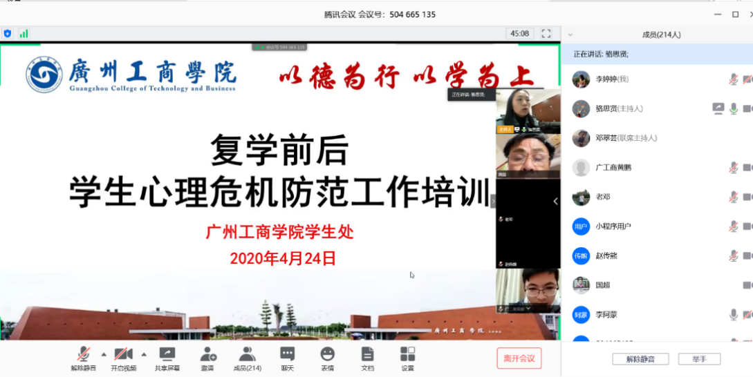 【本网讯】为贯彻落实《关于印发大专院校新冠肺炎疫情防控技术方案的通知》(国卫办疾控函〔2020〕304号)、《关于做好高校复学前后心理危机事件防范工作的通知》(粤高校心〔2020〕7号)精神,4月24日上午10点,我院邀请广东省高校心理健康教育与咨询专业委员会主任、广州中医院大学博士生导师邱鸿钟教授,开展“疫情背景下高校大学生的心身健康状况与心理危机防范”线上培训。学生处、保卫处、各系及二级学院学生工作分管领导,全体专职辅导员、宿管员、校医及安保人员线上参加培训。培训由我院心理咨询中心负责人骆思贤老师主持。