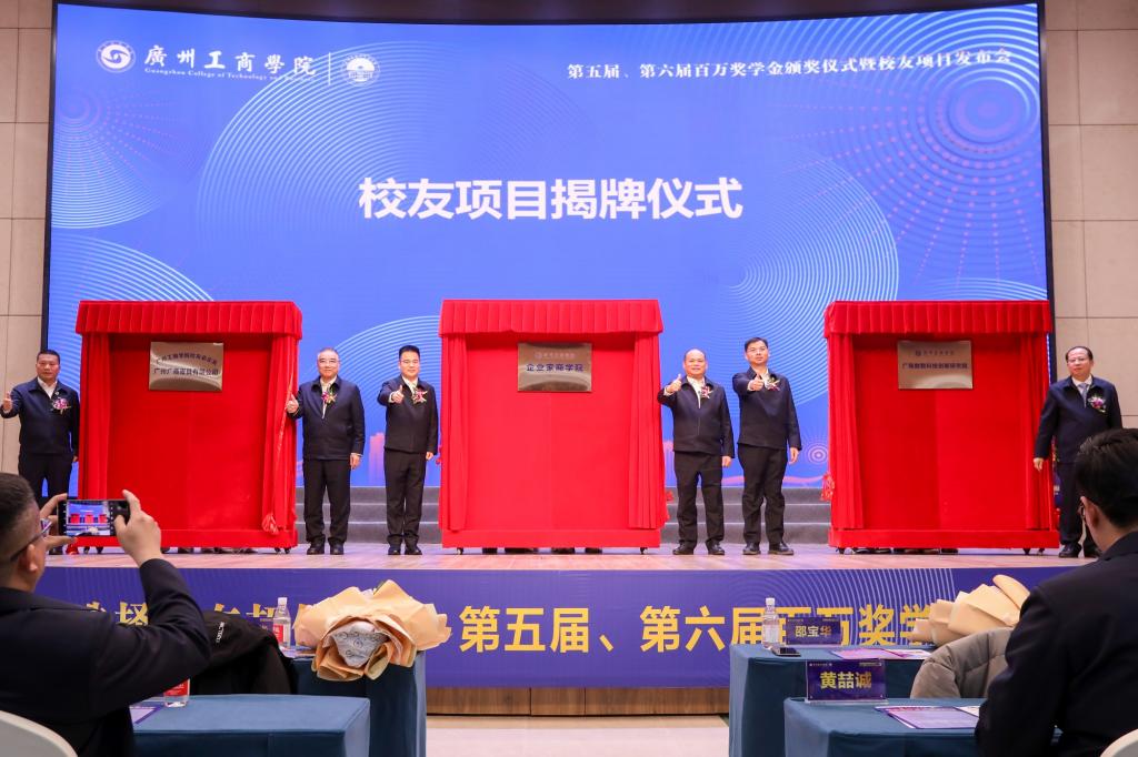 颁奖仪式后,广州广商皮具有限公司、广东省广商数智科技创新研究院(有限公司)、kaiyun开云官方网站企业家商学院三项校友会项目正式发布。校友会项目集科技创新与科学研究于一体,通过与学校、企业和政府的紧密合作,推动产学研的深度融合,积极探索面向产教融合的应用型教学改革方式方法,构建多元化育人机制。学校董事长邵宝华、校长王日华、党委书记张振超,校友项目代表杨锦全、潘寿璋、钟院生为校友会项目进行揭牌。