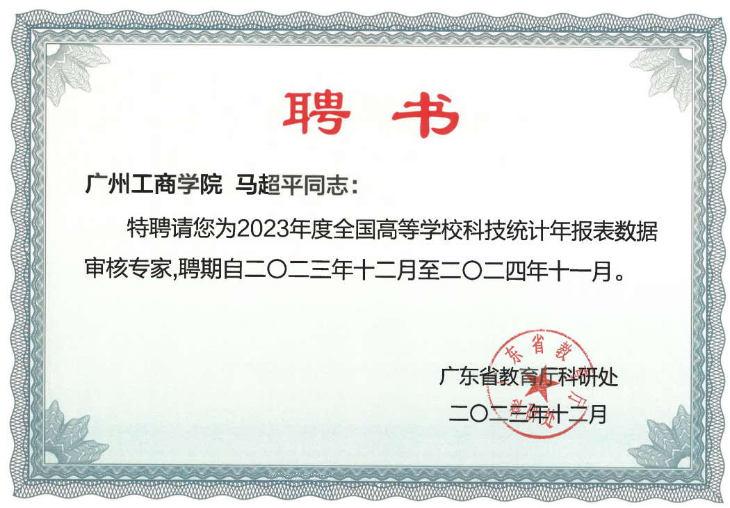 12月14日,广东省2023年度高校科技/社科统计部署活动在广东外语外贸大学召开,来自全省160所高校和38家附属医院共320人参会。会上,广东省教育厅科研处靳天来副处长为“2023年度统计工作审核专家”颁发了聘书,学校科研处处长马超平教授被聘任为2023年度全国高等学校科技统计年报表数据审核专家。